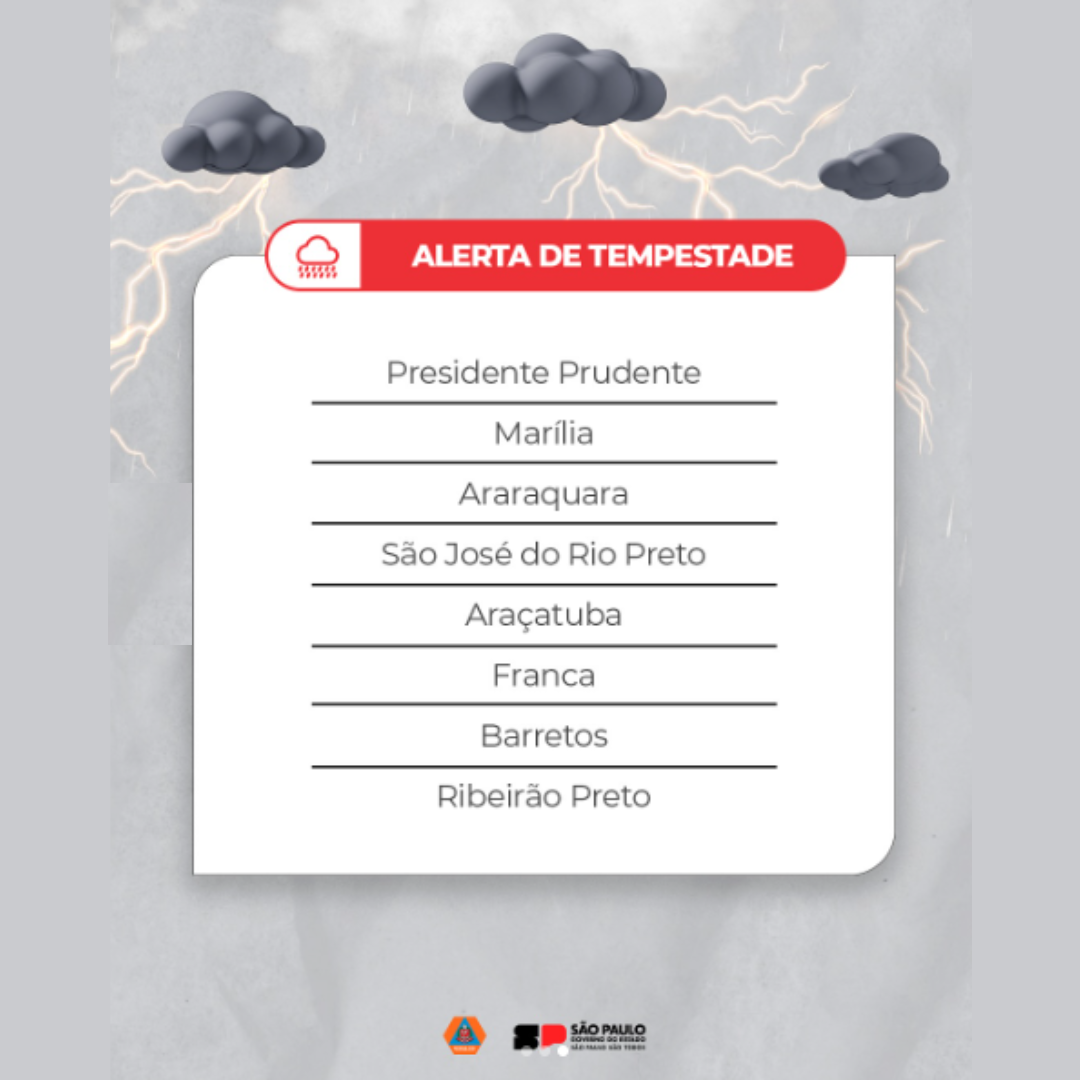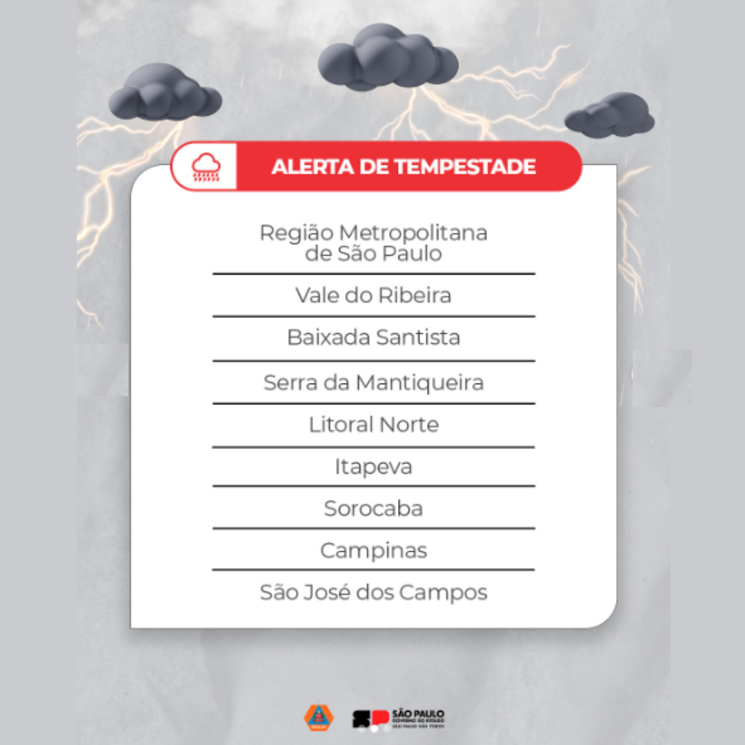 Entre domingo (08) e segunda-feira (09), o Estado de São Paulo enfrentará risco de fortes chuvas, com raios, rajadas intensas de vento e granizo.