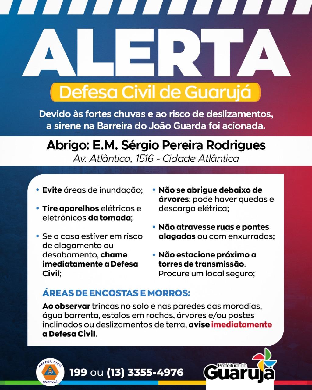A Defesa Civil emitiu um alerta de fortes chuvas na região. A sirene da comunidade da Barreira foi acionada, e os moradores devem se deslocar imediatamente para um local seguro. A Escola Sergio Pereira está disponível para abrigar a população em áreas de risco.