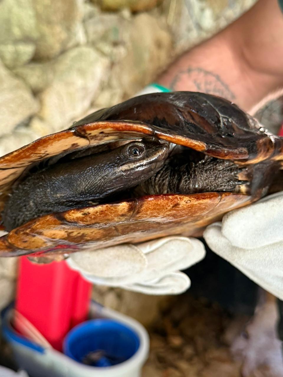 No mesmo dia, o GDA foi acionado para recolher uma tartaruga no Condomínio Albamar, porém a equipe constatou que se tratava de um cágado-pescoço-de-cobra (Hydromedusa tectifera), espécie subaquática, comum na região. O animal foi resgatado por um funcionário de uma das residências, ao passar pela rodovia próxima ao local, e a moradora acionou o GDA.